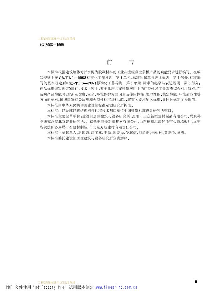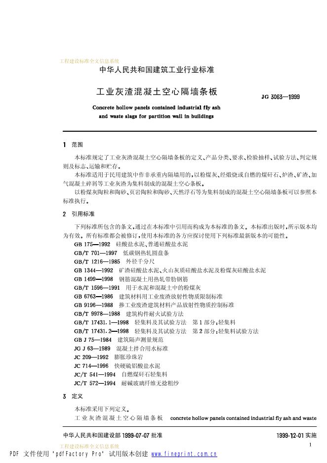 JG 3063-1999 工业灰渣混凝土空心隔墙条板
