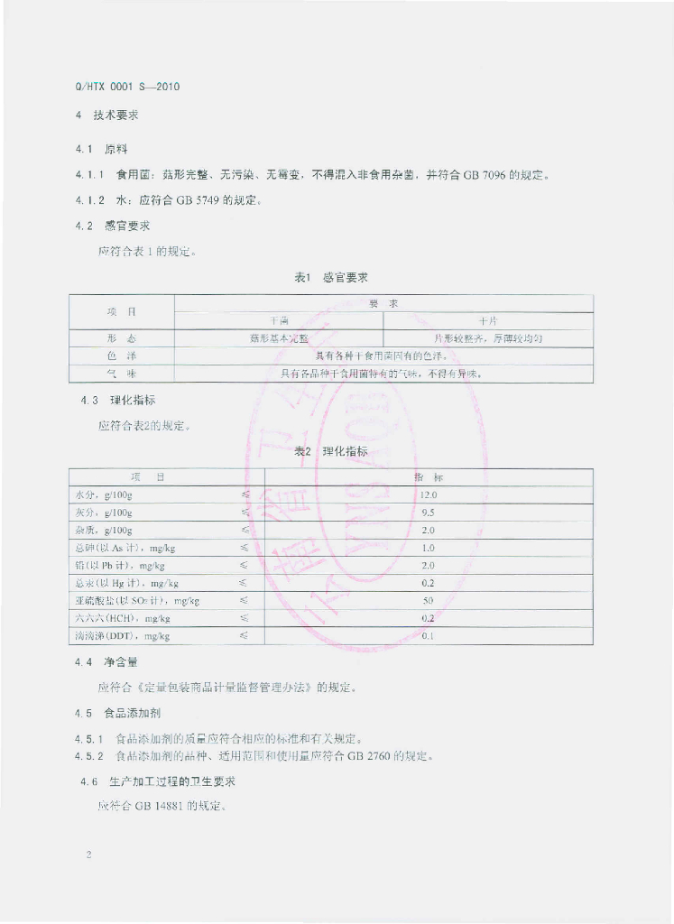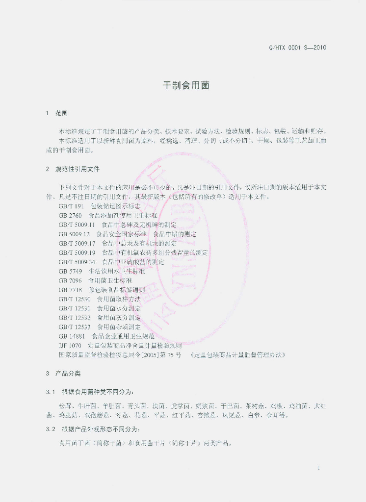 Q/HTX 0001S-2010 干制食用菌