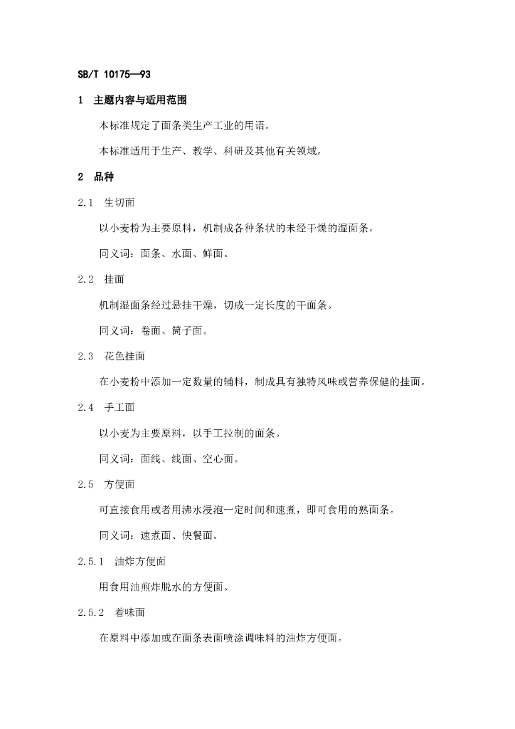 SB/T 10175-1993 面条类生产工业用语(LS/T 1104-1993)