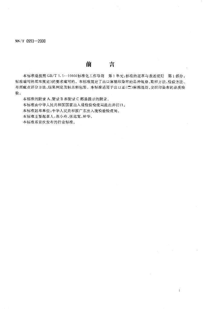 SN/T 0953-2000 进出口麻棉印染布检验规程