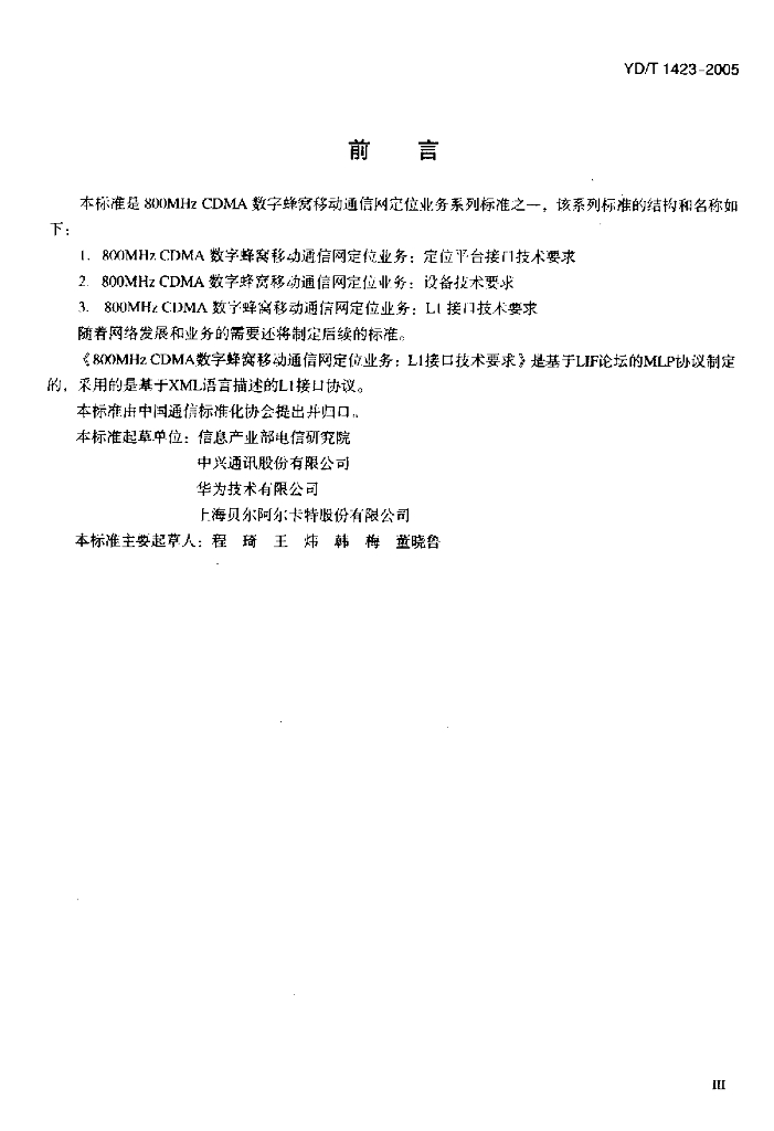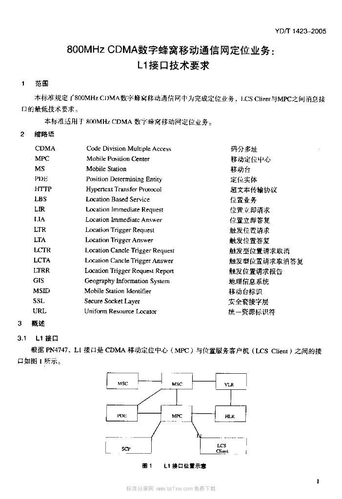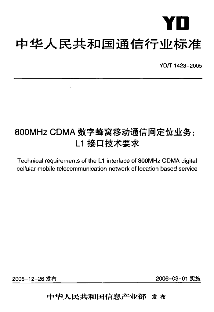 YD/T 1423-2005 800MHz CDMA 数字蜂窝移动通信网定位业务: L1 接口技术要求