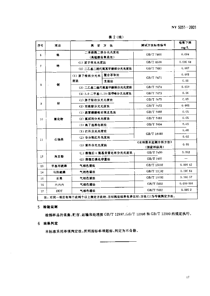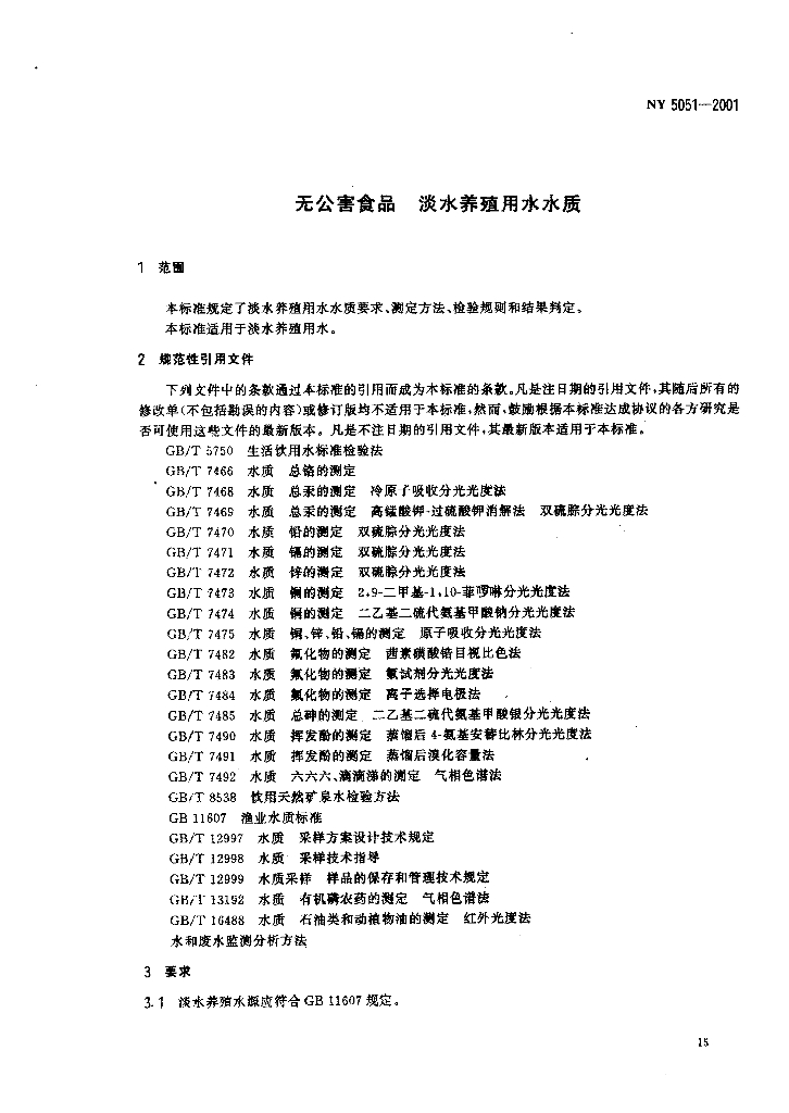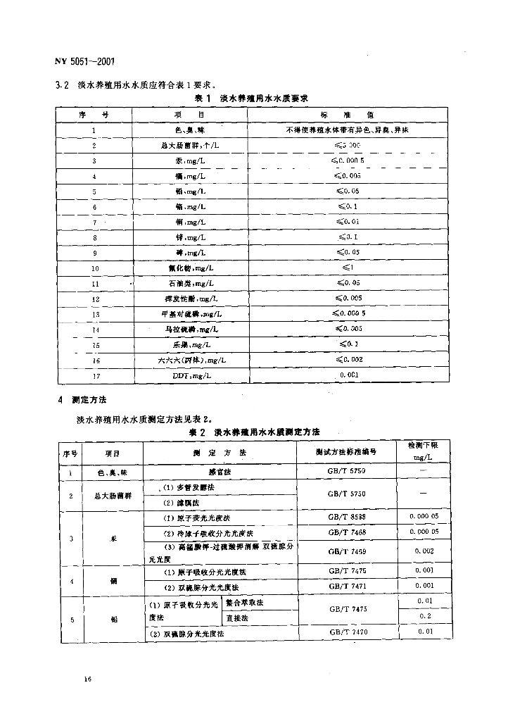 NY 5051-2001 无公害食品 淡水养殖用水水质