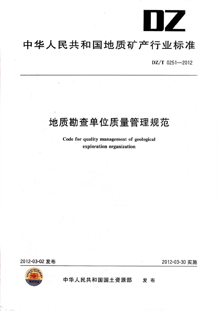 DZ/T 0251-2012 地质勘查单位质量管理规范