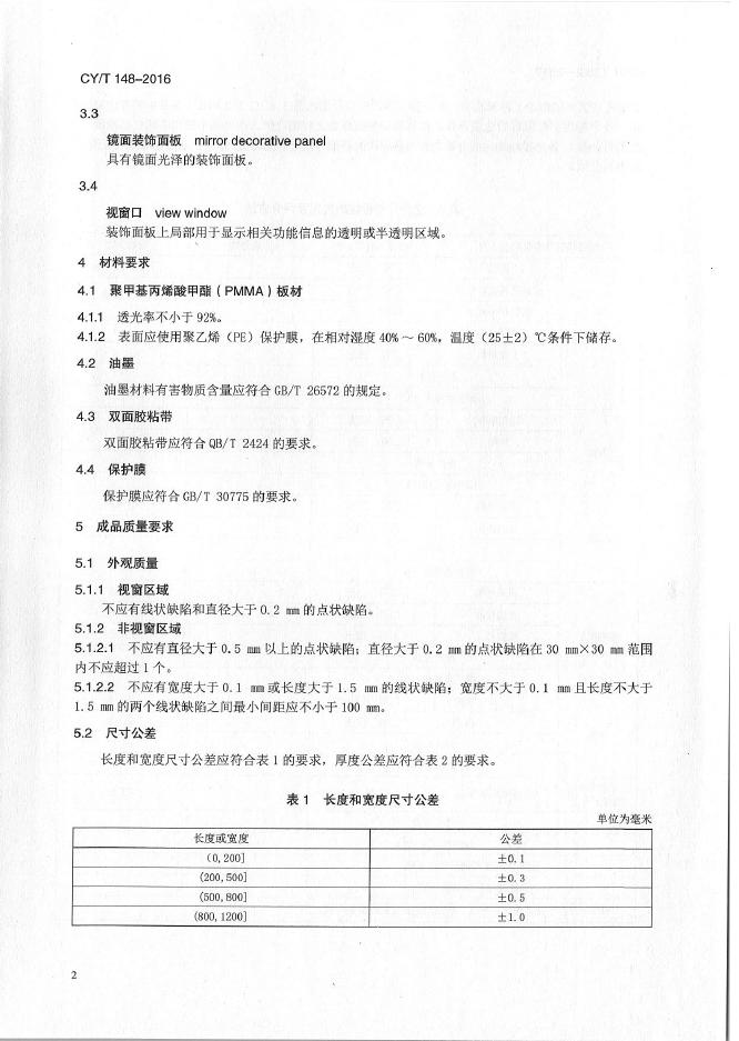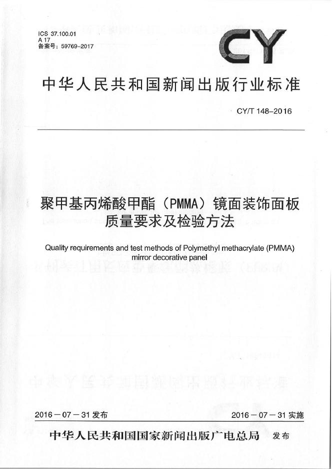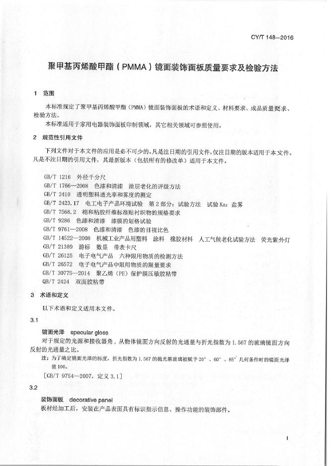 CY/T 148-2016 聚甲基丙烯酸甲酯(PMMA)镜面装饰面板质量要求及检验方法