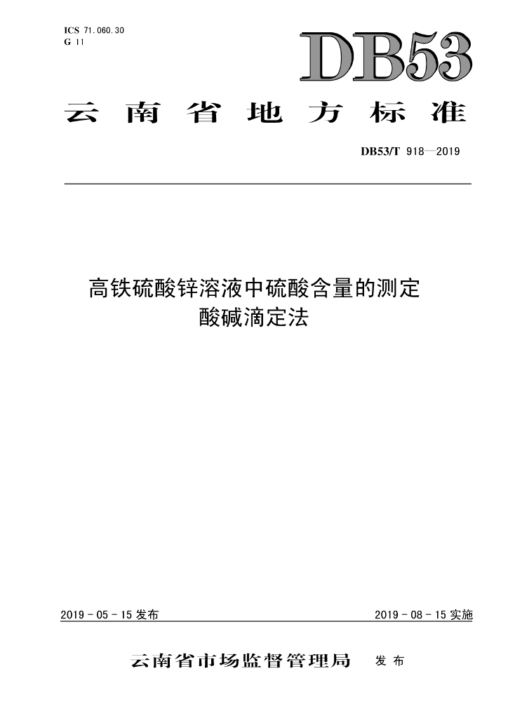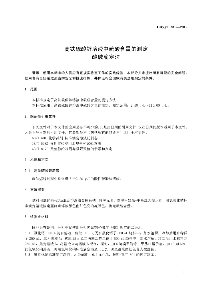 DB53/T 918-2019 高铁硫酸锌溶液中硫酸含量的测定 酸碱滴定法