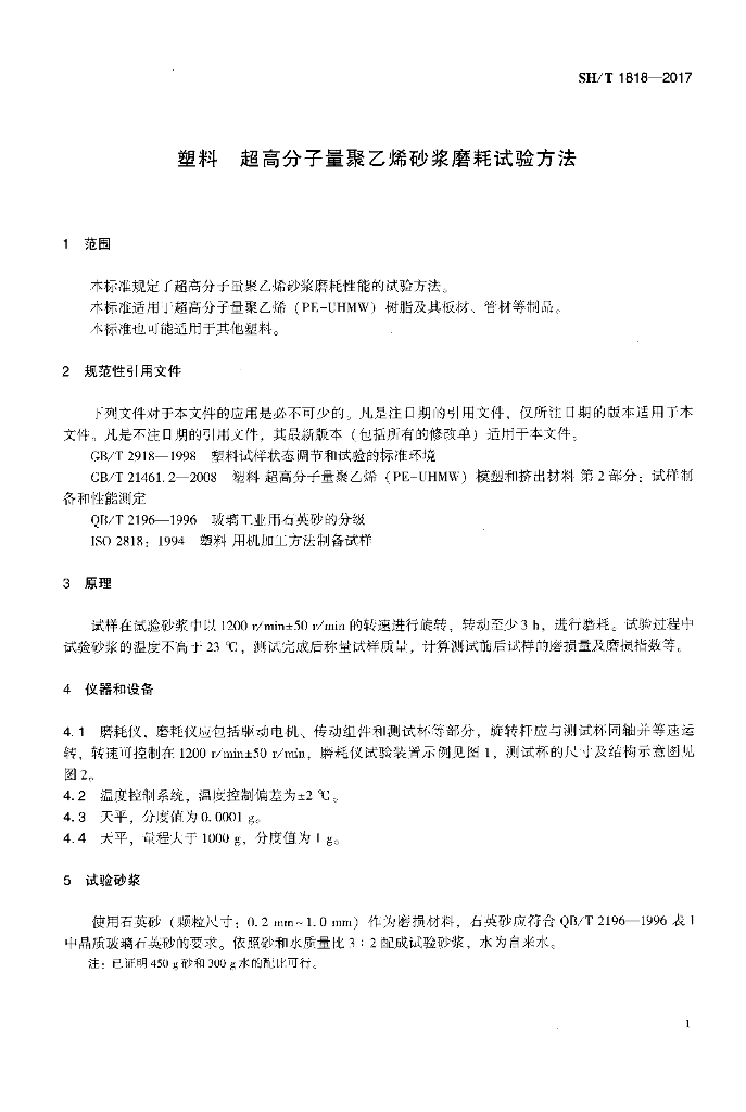 SH/T 1818-2017 塑料 超高分子量聚乙烯砂浆磨耗试验方法