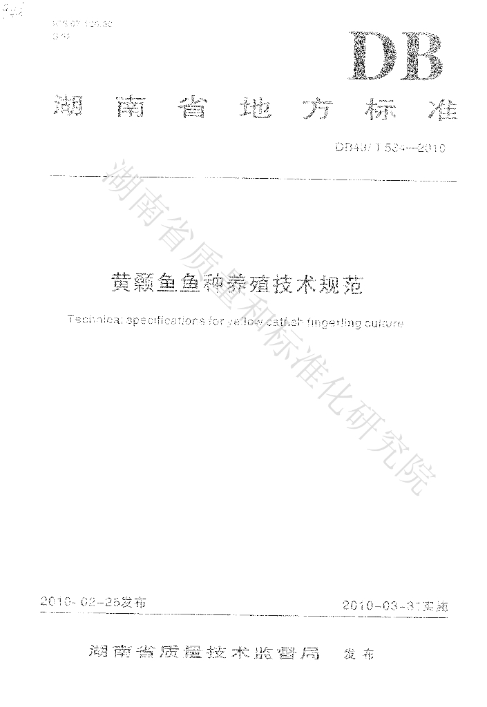 DB43/T 534-2010 黄颡鱼鱼种养殖技术规范