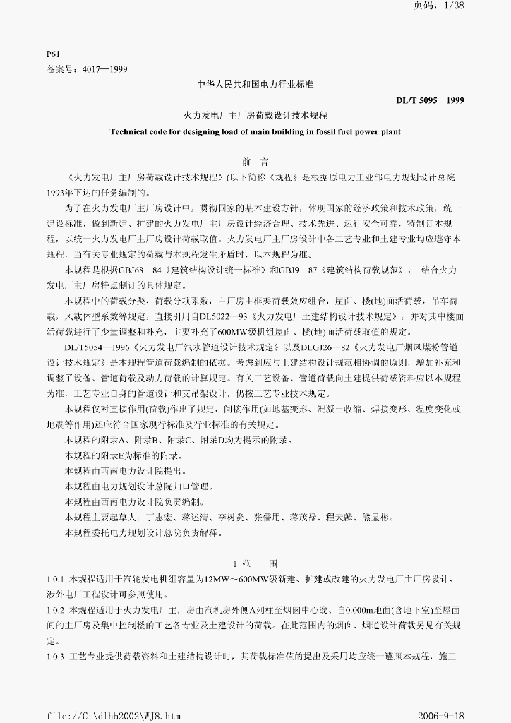 DL/T 5095-1999 火力发电厂主厂房荷载设计技术规程