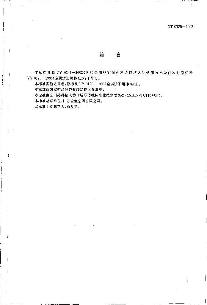 YY 0120-2002 骨接合植入物金属矫形用棒