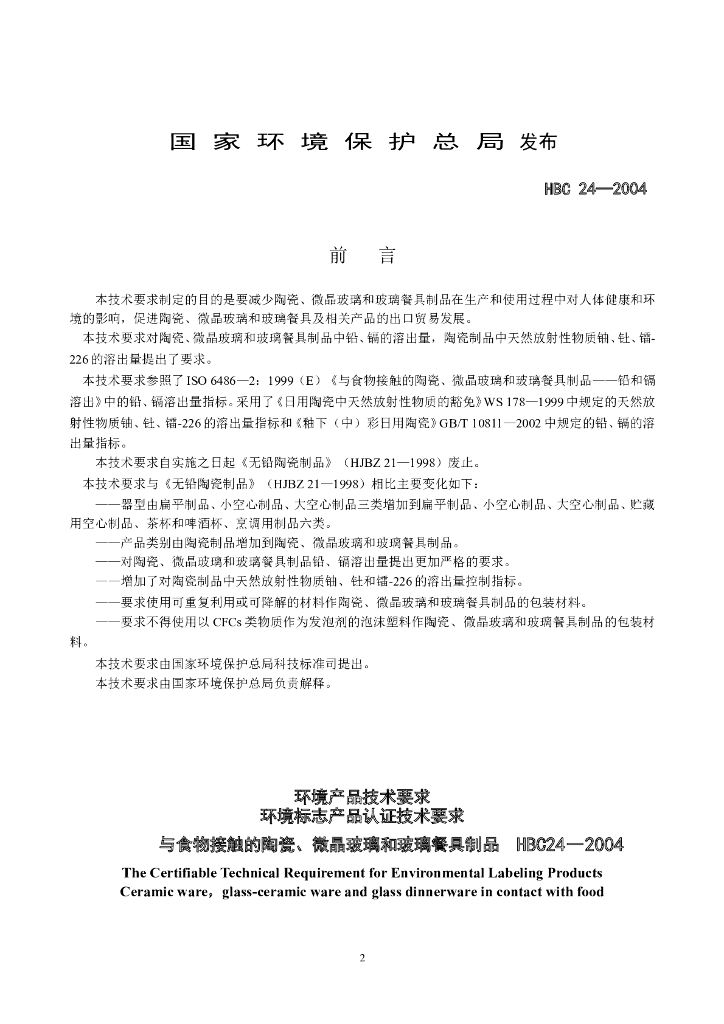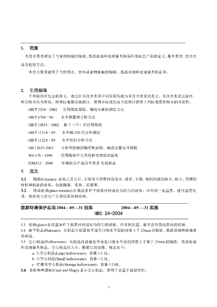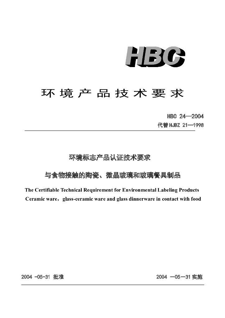 HBC 24-2004 环境标志产品认证技术要求 与食物接触的陶瓷、微晶玻璃和玻璃餐具制品