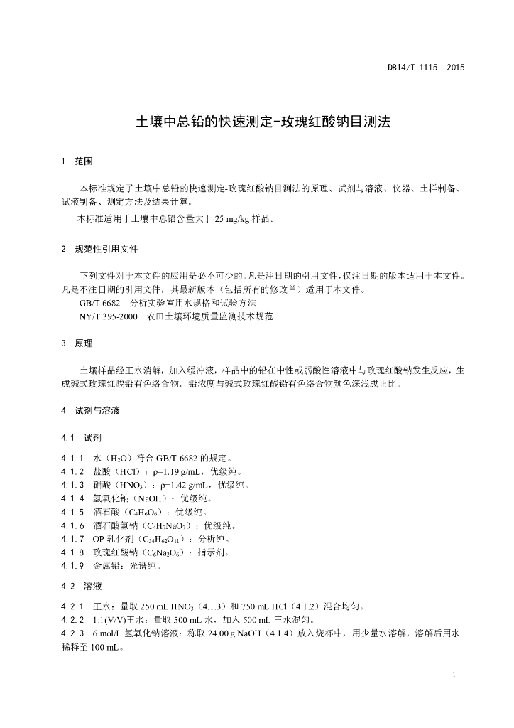 DB14/T 1115-2015 土壤中总铅的快速测定-玫瑰红酸钠 目测法