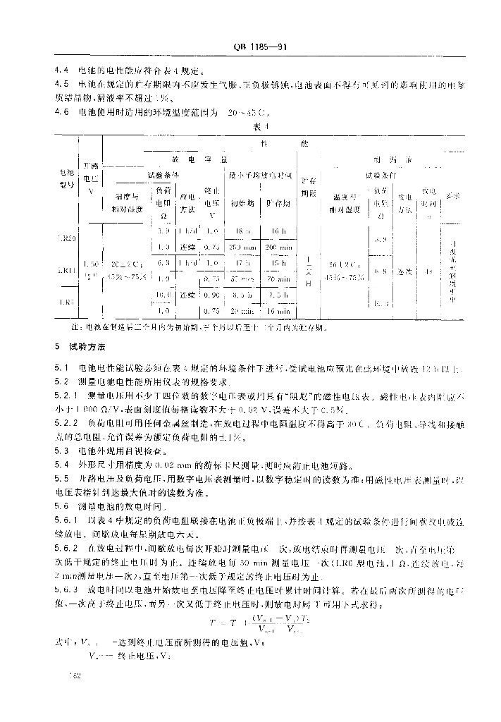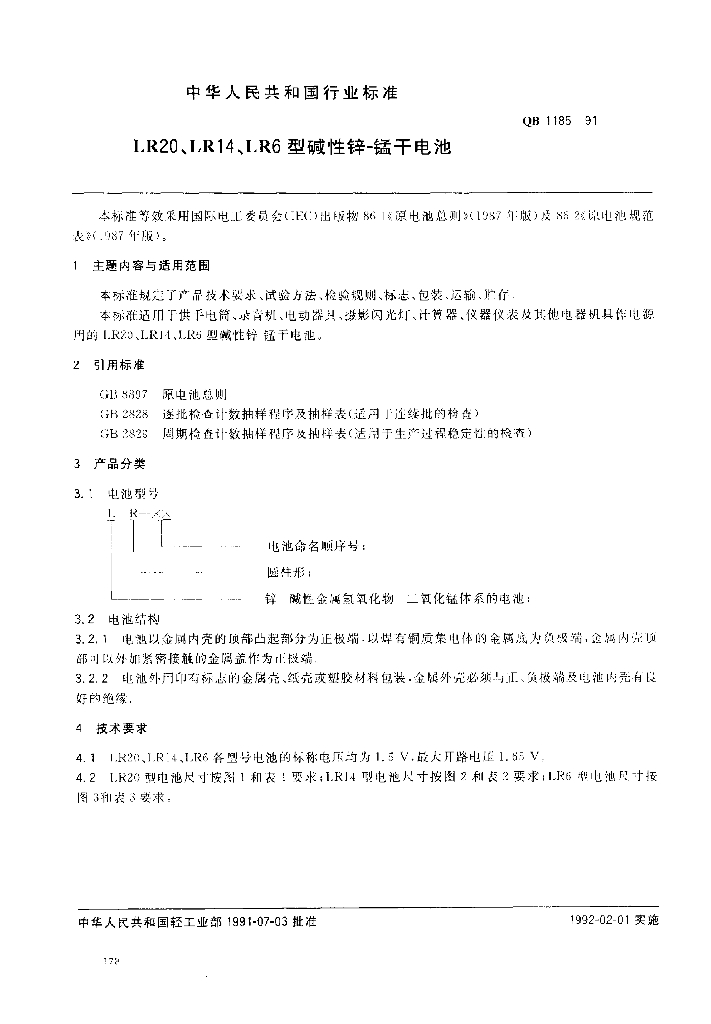 QB 1185-1991 LR20、LR14、LR6型碱性锌锰干电池