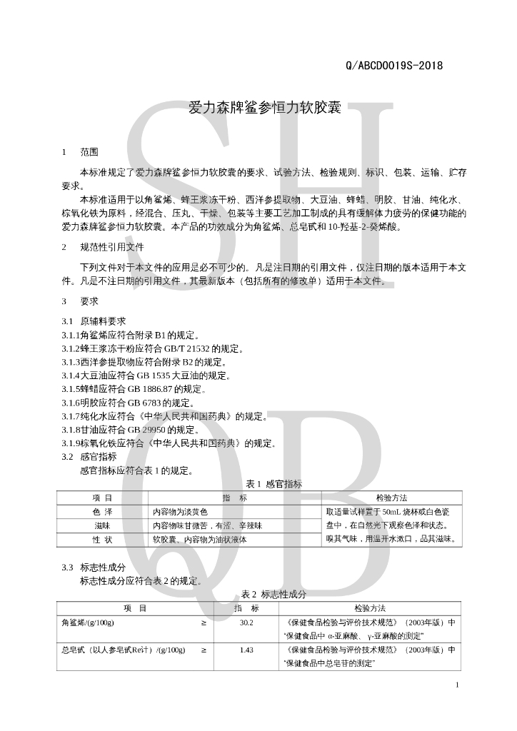 Q/ABCD 0019S-2018 爱力森牌鲨参恒力软胶囊