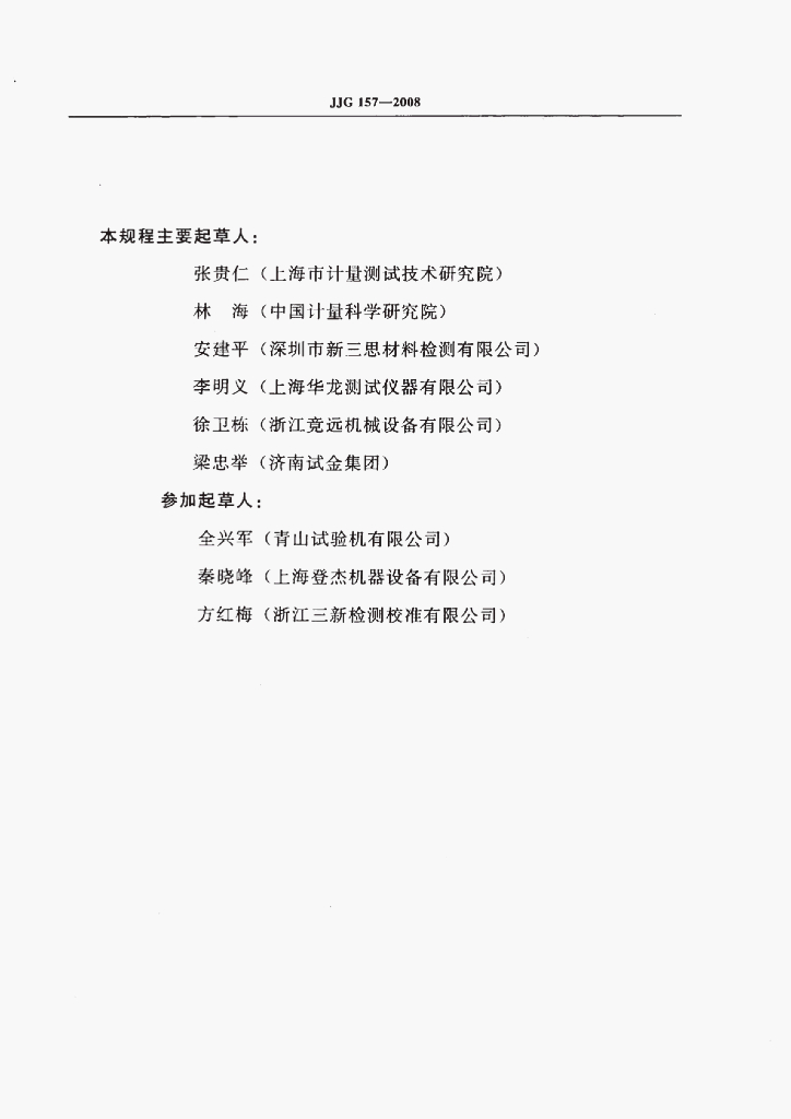 张贵仁(上海市计量测试技术研究院)、林海(中国计量科学研究院)、安建平(深圳市新三思材料检测有限公司)、李明义(上海华龙测试仪器有限公司)、徐卫栋(浙江竞远机械设备有限公司)、梁忠举(济南试金集团)、全兴军(青山试验机有限公司)、秦晓峰(上海登杰机器设备有限公司)、方红梅(浙江三新检测校准有限公司)