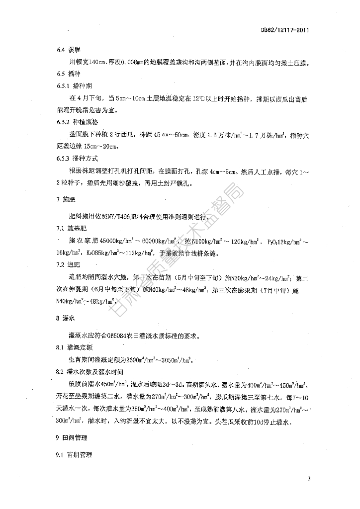 DB62/T 2117-2011 西瓜垄膜沟灌节水栽培技术规程