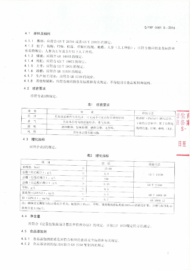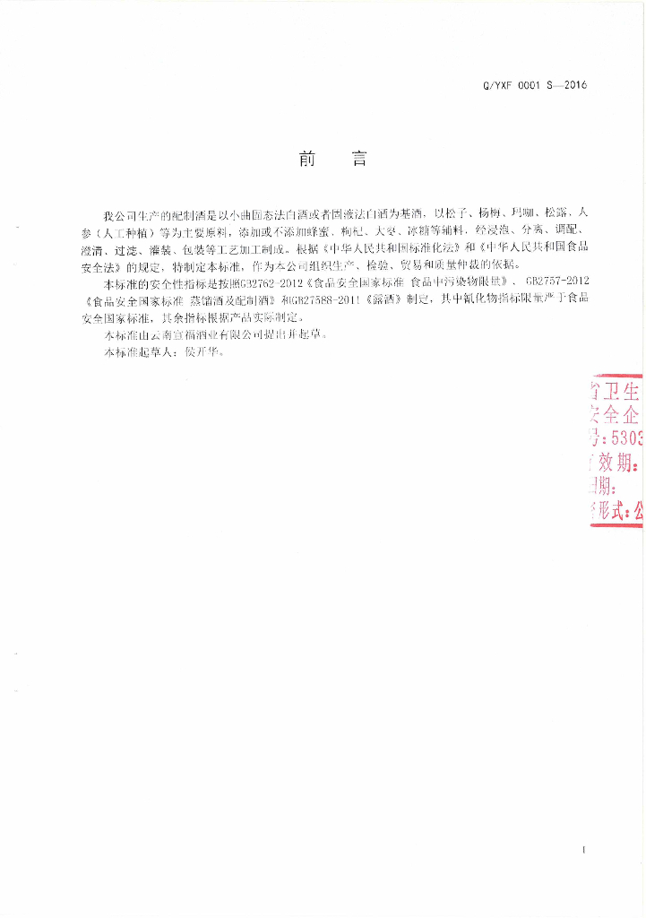 Q/YXF 0001S-2016 云南宣福酒业有限公司企业标准 配制酒