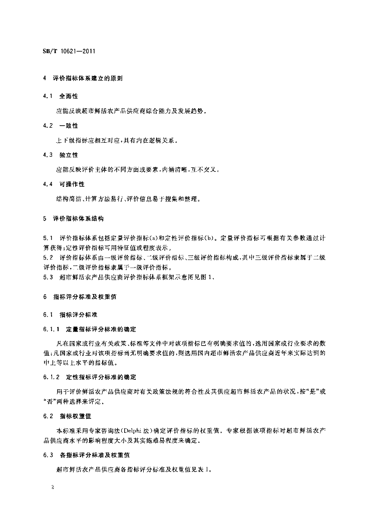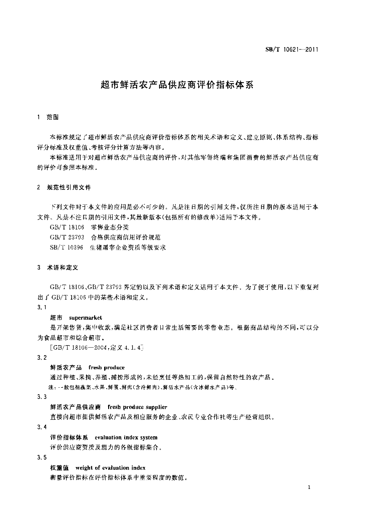 SB/T 10621-2011 超市鲜活农产品供应商评价指标体系