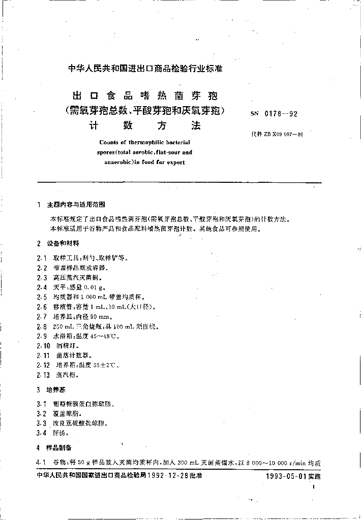 SN 0178-1992 出口食品嗜热菌芽孢(需氧芽孢总数、平酸芽孢和厌氧芽孢)计数方法