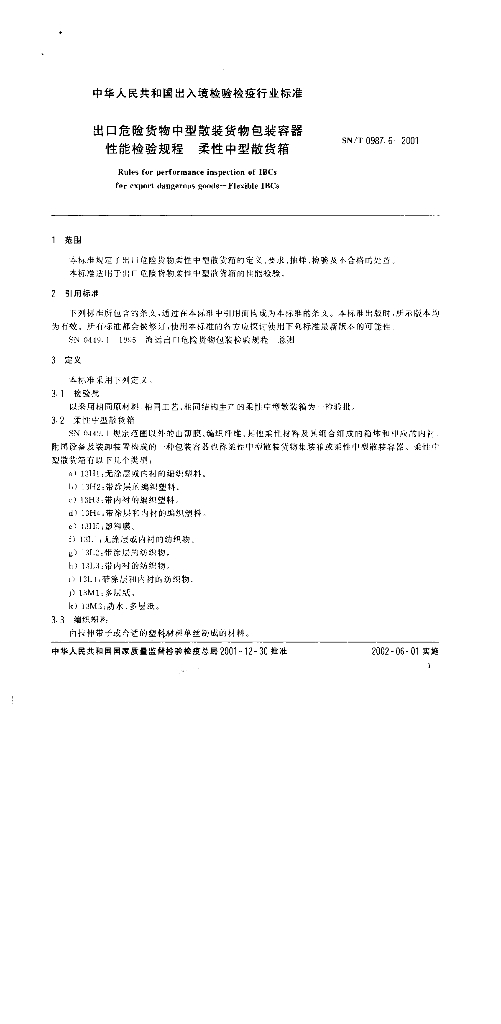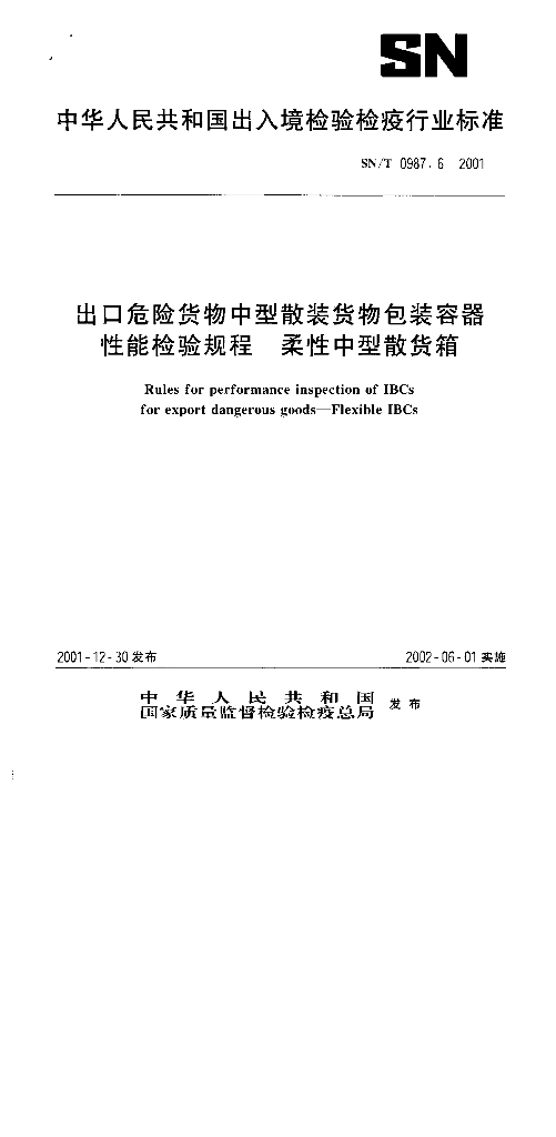 SN/T 0987.6-2001 出口危险货物中型散装货物包装容器性能检验规程 柔性中型散货箱