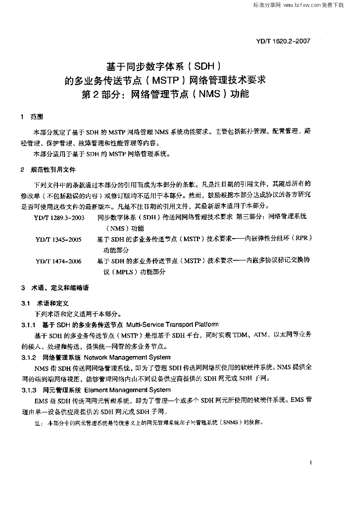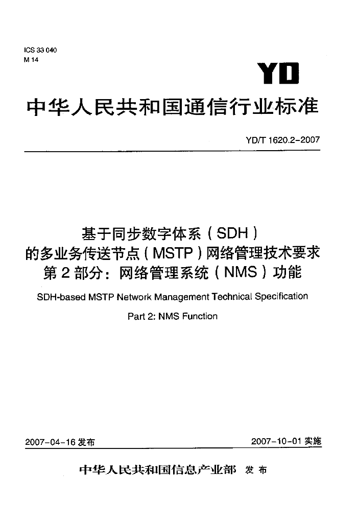 YD/T 1620.2-2007 基于同步数字体系(SDH)的多业务传送节点(MSTP)网络管理技术要求 第2部分:网络管理系统(NMS)功能