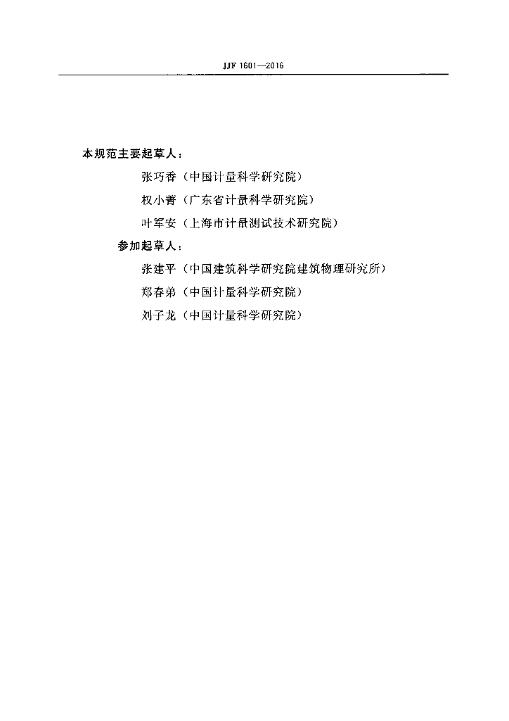 张巧香(中国计量科学研究院)、权小菁(广东省计量科学研究院)、叶军安(上海市计量测试技术研究院)、张建平(中国建筑科学研究院建筑物理研究所)、郑春弟(中国计量科学研究院)、刘子龙(中国计量科学研究院)