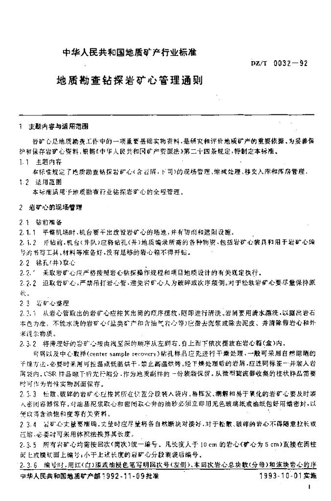 DZ/T 0032-1992 地质勘查钻探岩矿心管理通则