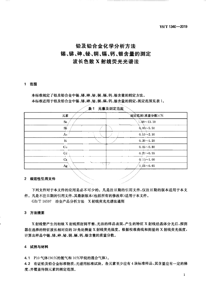 YS/T 1340-2019 铅及铅合金化学分析方法 锡、锑、砷、铋、铜、镉、钙、银含量的测定 波长色散X射线荧光光谱