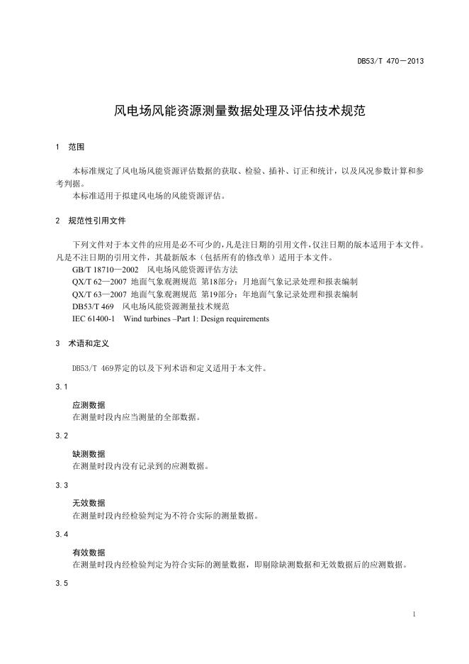 DB53/T 470-2013 风电场风能资源测量数据处理及评估技术规范