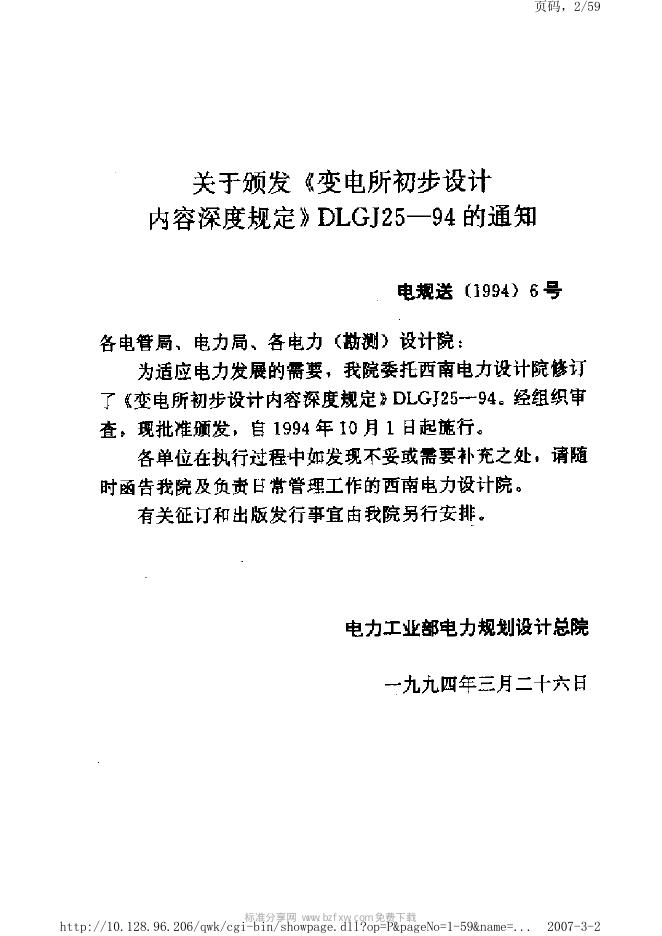 DLGJ 25-1994 变电所初步设计文件内容深度规定