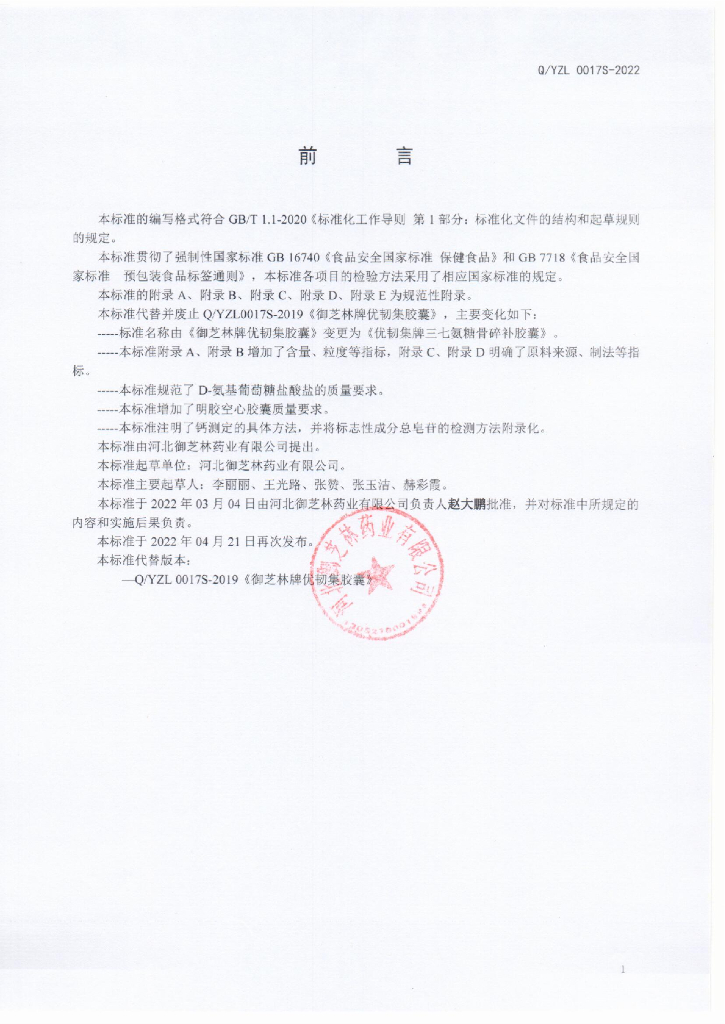 Q/YZL 0017S-2022 优韧集牌三七氨糖骨碎补胶囊
