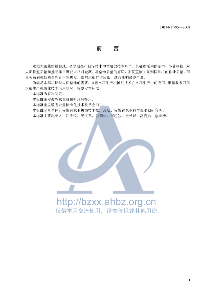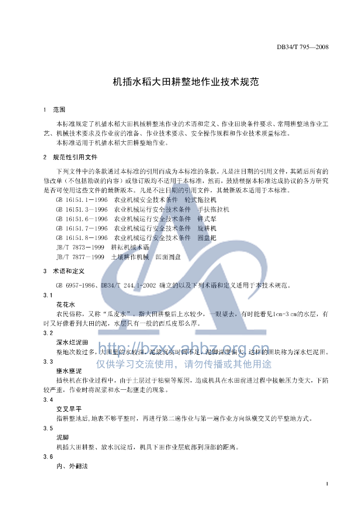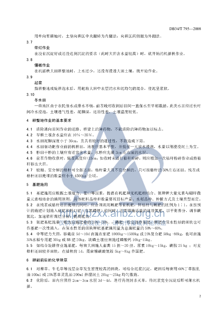 DB34/T 795-2008 机插水稻大田耕整地作业技术规范