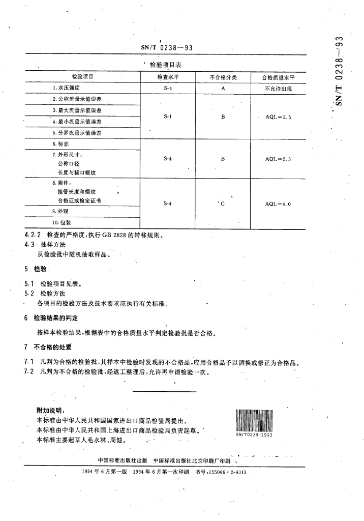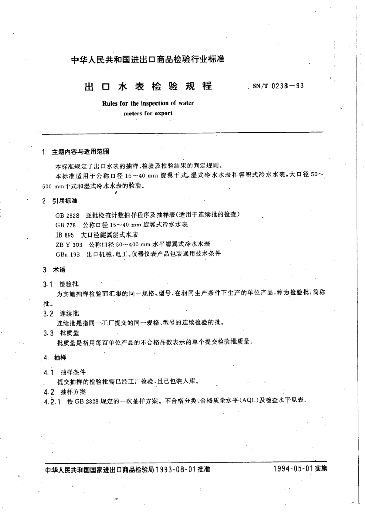 SN/T 0238-1993 出口水表检验规程