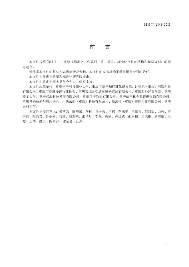 重庆电子科技职业大学、重庆市质量和标准化研究院、沙师弟(重庆)网络科技有限公司、重庆市冷藏冷链行业协会、重庆市综合交通运输研究所有限公司、重庆对外经贸学院、重庆学、重庆盛海科技发展有限公司、重庆百宁物流有限公司、重庆倍得林企业管理咨询有限公司、理工大重庆条码技术与应用协会、中通云配(重庆)科技有限公司、斯派得(重庆)物流科技有限公司、重庆医科大学。