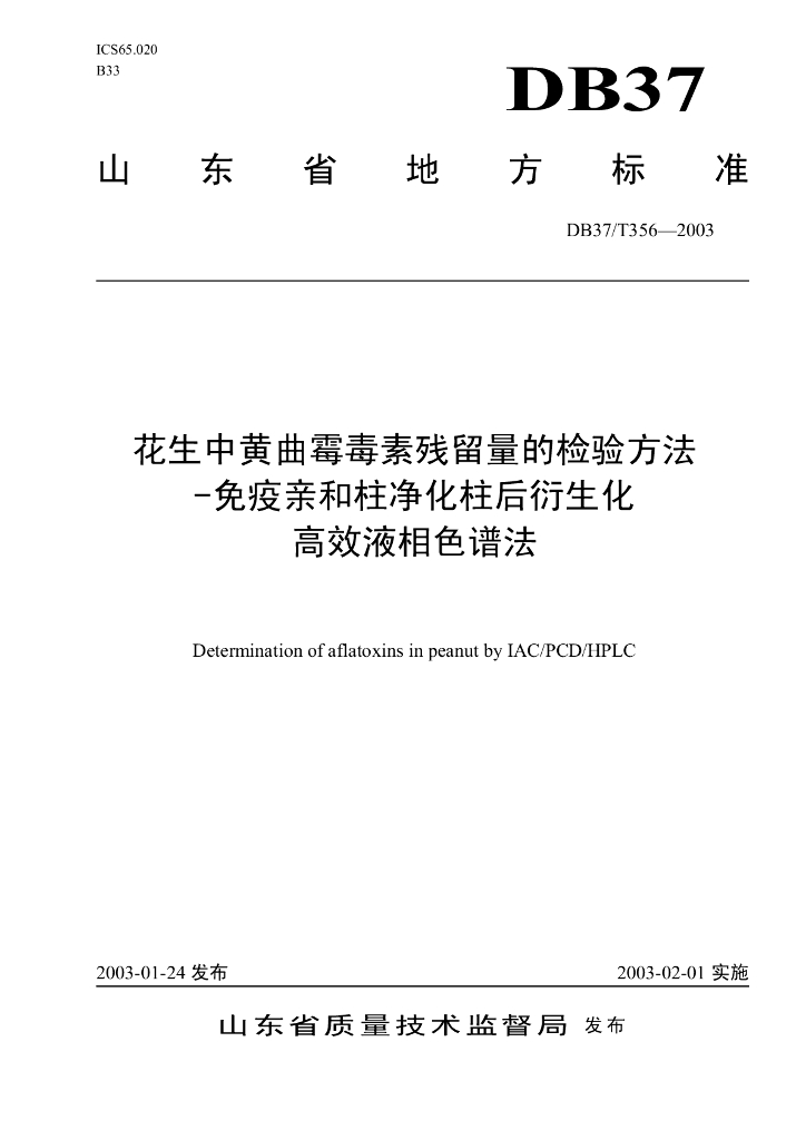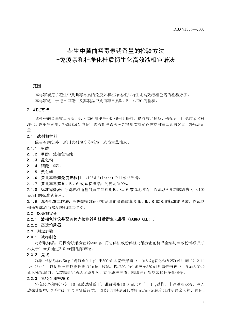 DB37/T 356-2003 花生中曲霉毒素残留量的检验方法-免疫亲和柱净化柱后衍生化高效液相色谱法