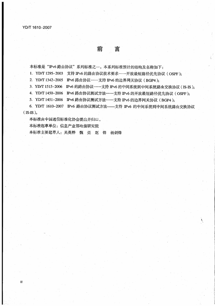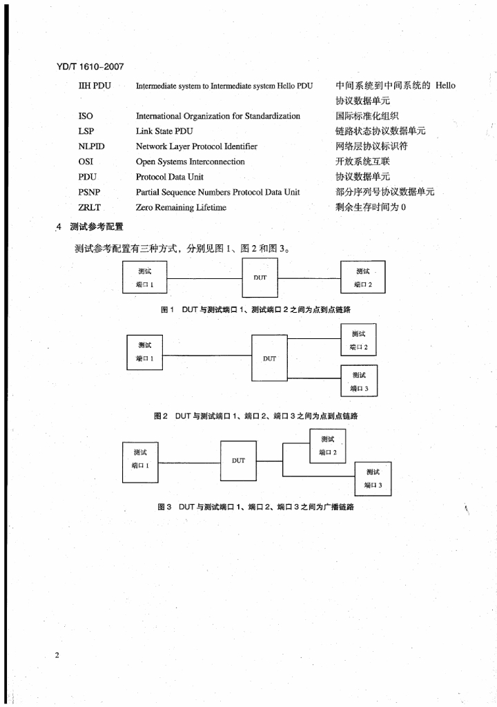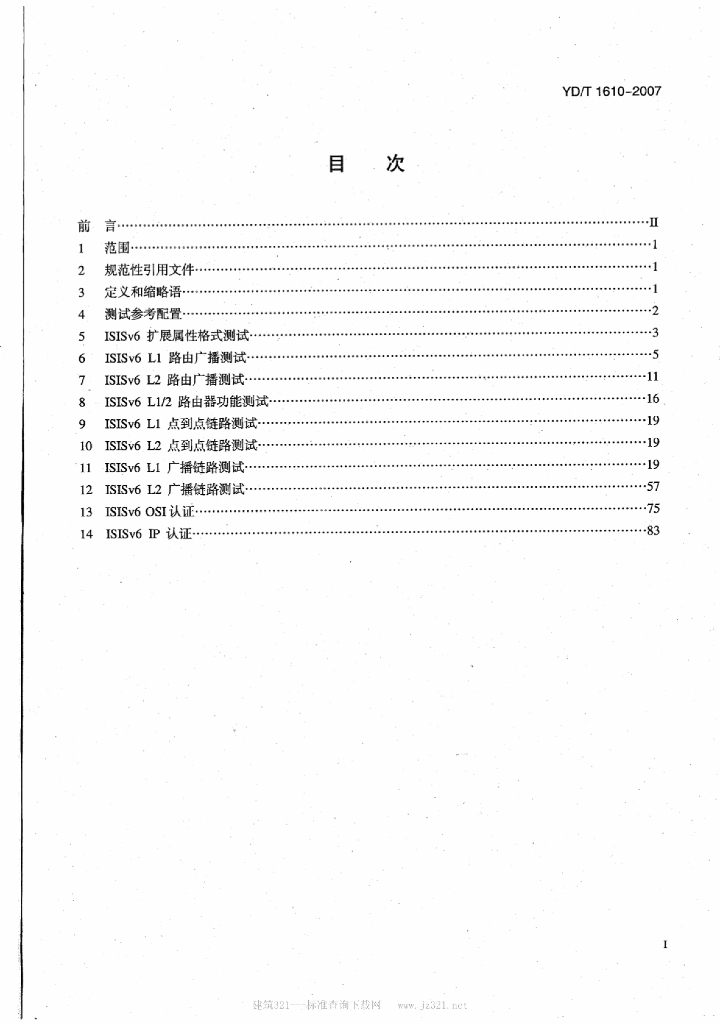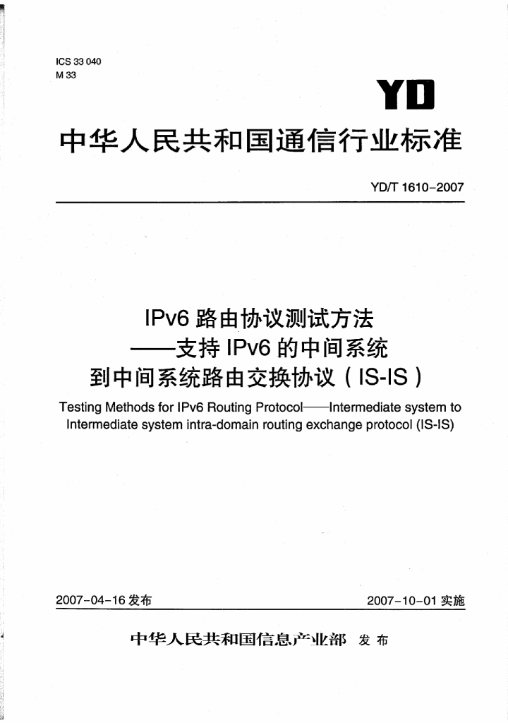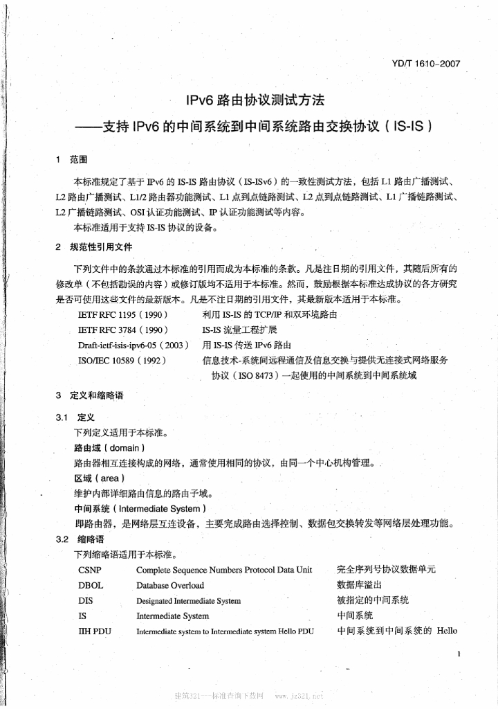 YD/T 1610-2007 IPv6 路由协议测试方法——支持 IPv6 的中间系统到中间系统路由交换协议(IS-IS)