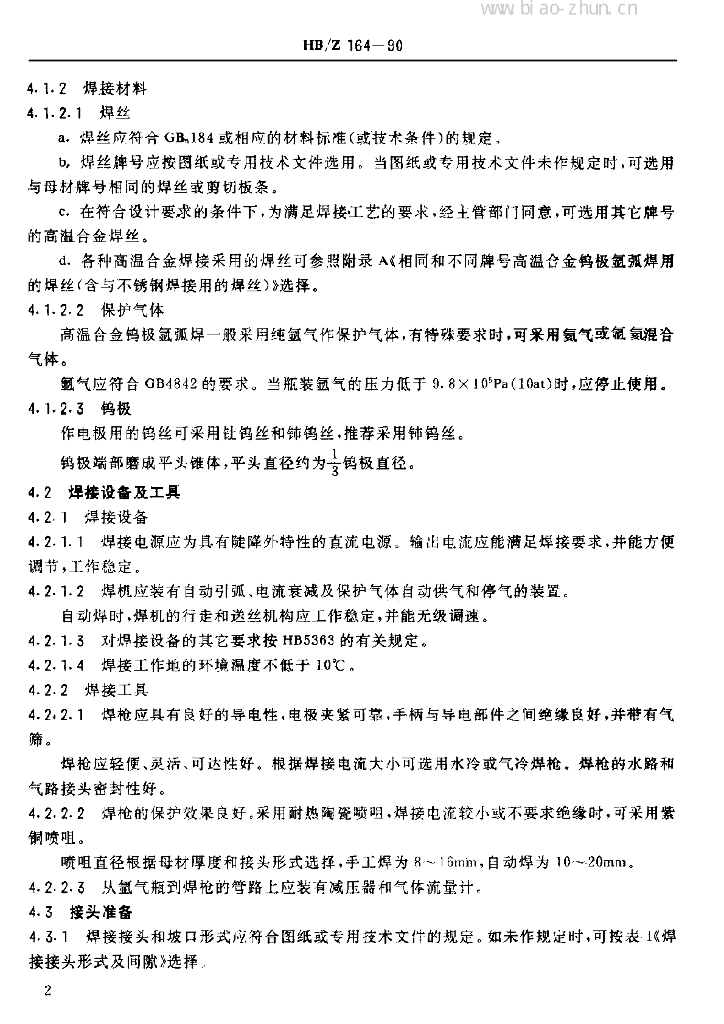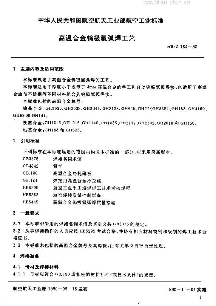 HB/Z 164-1990 高温合金钨极氩弧焊工艺