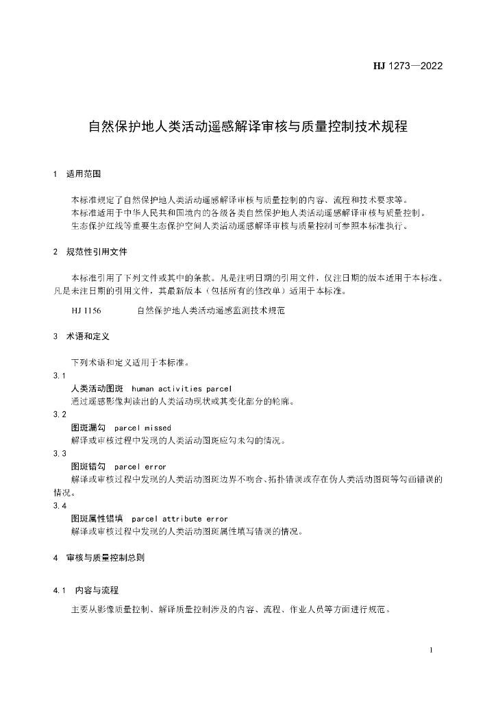 HJ 1273-2022 自然保护地人类活动遥感解译审核与质量控制技术规程
