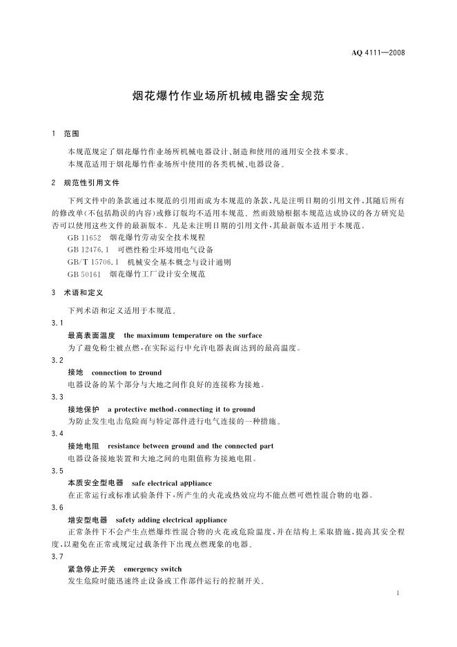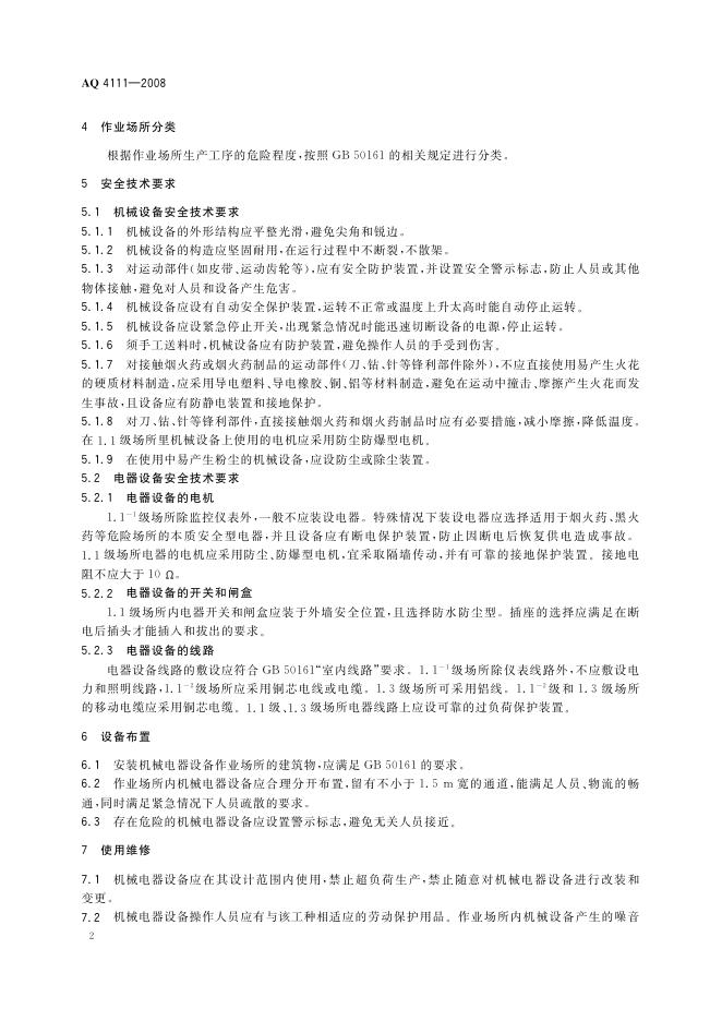 AQ 4111-2008 烟花爆竹作业场所机械电器安全规范