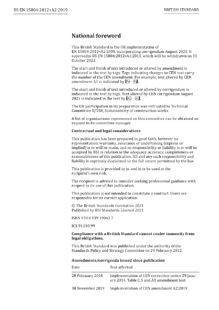 BS EN 15804-2019 建设工程的可持续性 环境无害产品声明 产品分类和建筑产品的核心规则(英文版)