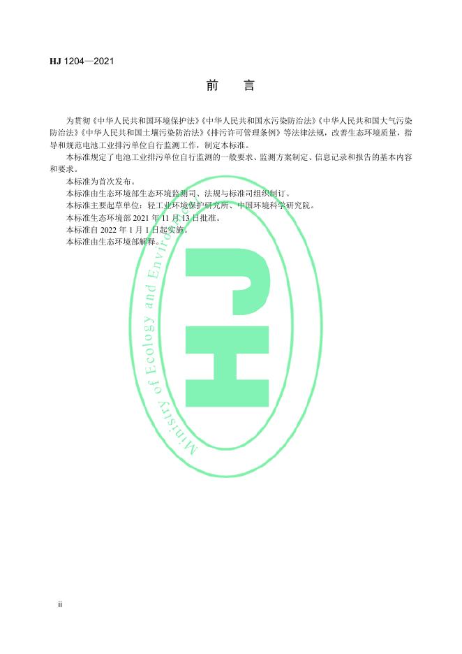 HJ 1204-2021 排污单位自行监测技术指南 电池工业