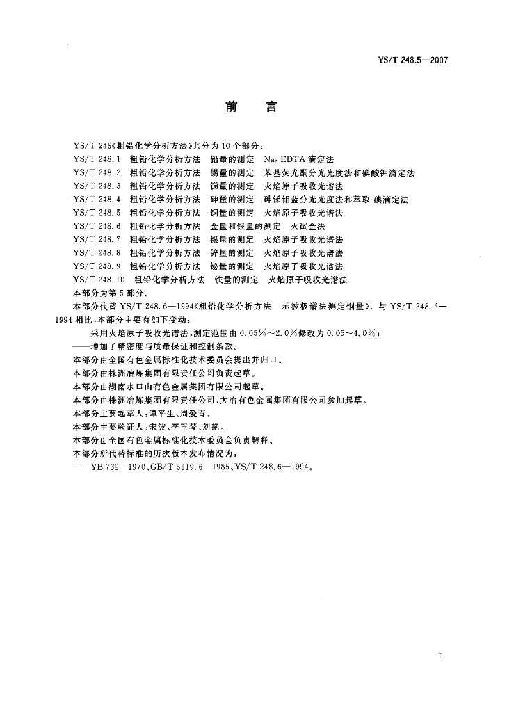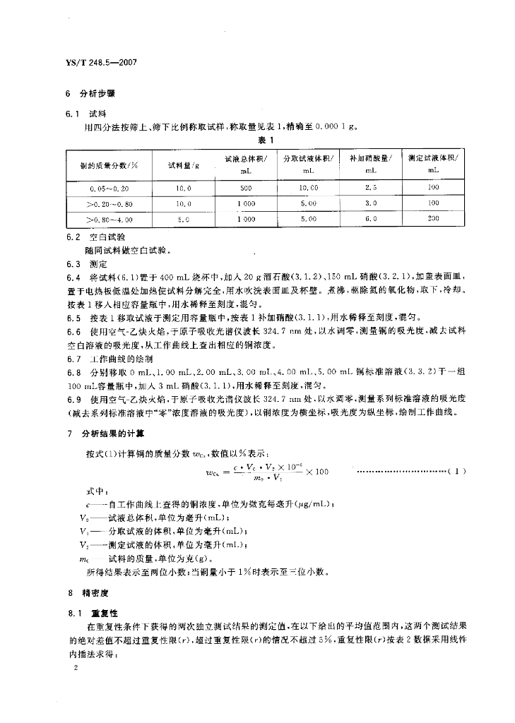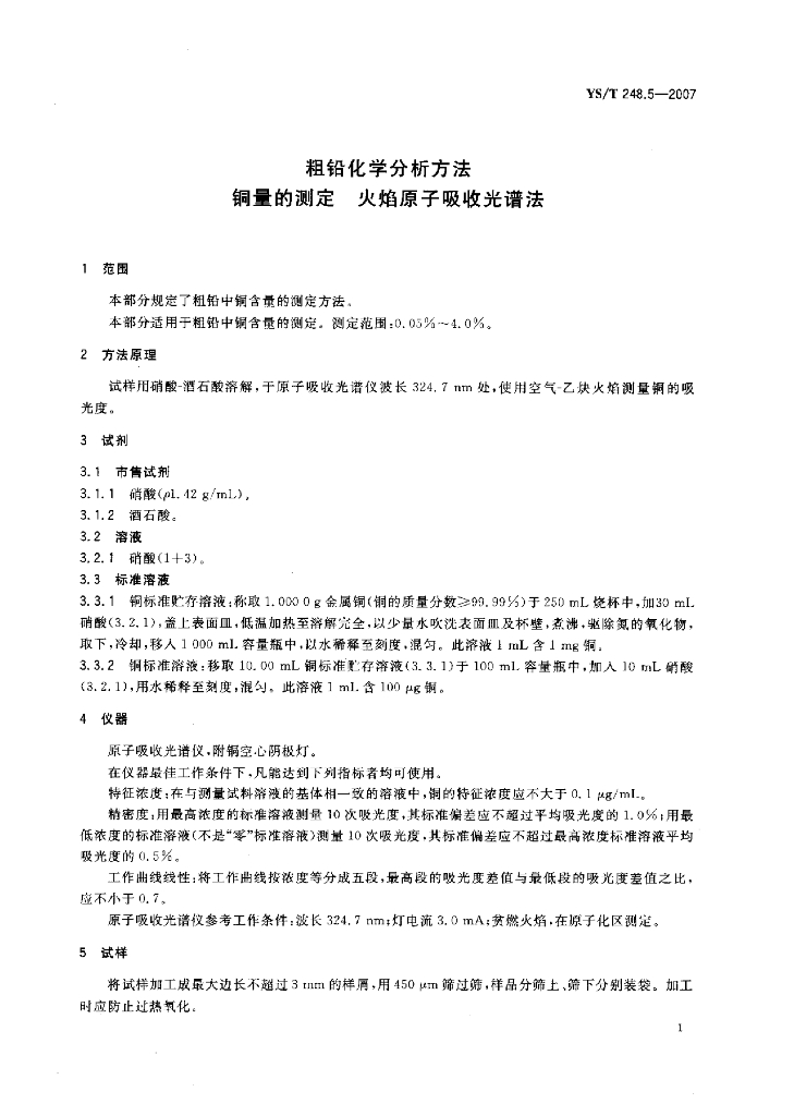 YS/T 248.5-2007 粗铅化学分析方法铜量的测定火焰原子吸收光谱法