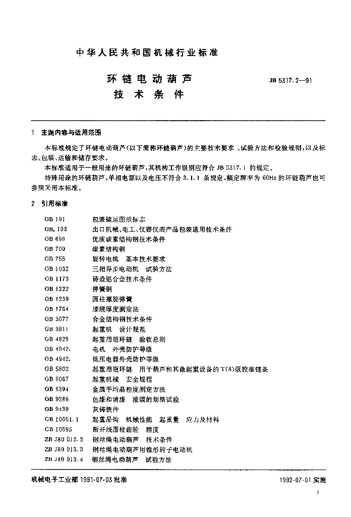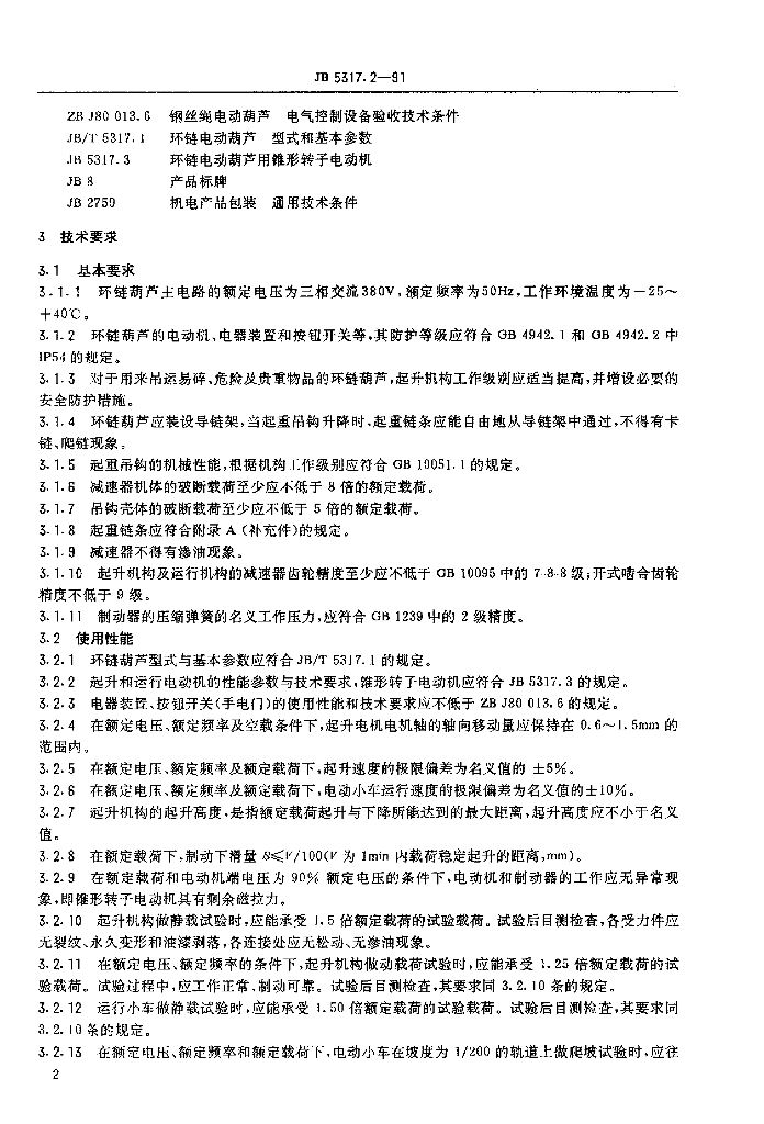 JB/T 5317.2-1991 环链电动葫芦 技术条件