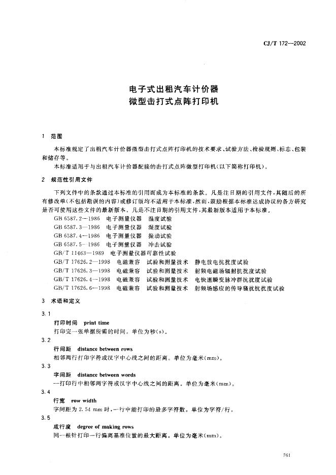 CJ/T 172-2002 电子式出租汽车计价器 微型击打式点阵打印机
