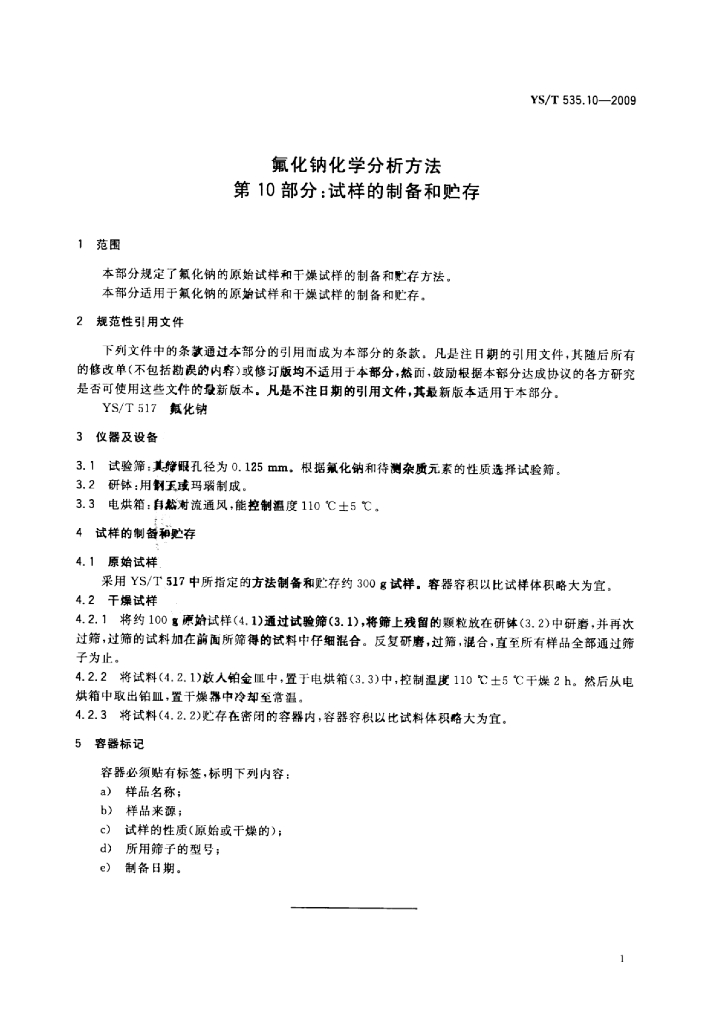 YS/T 535.10-2009 氟化钠化学分析方法 第10部分:试样的制备和贮存