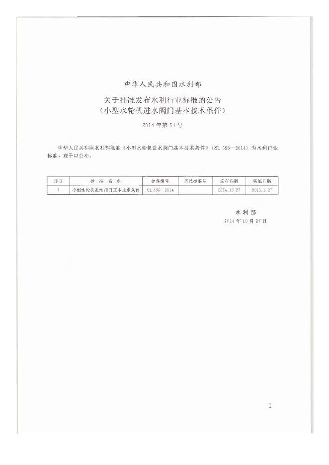SL/T 696-2014 小型水轮机进水阀门基本技术条件