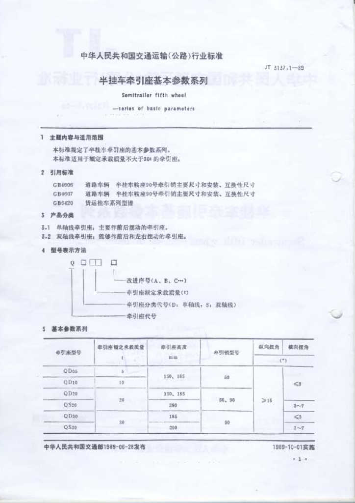 JT 3137.1-1989 半挂车牵引座基本参数系列