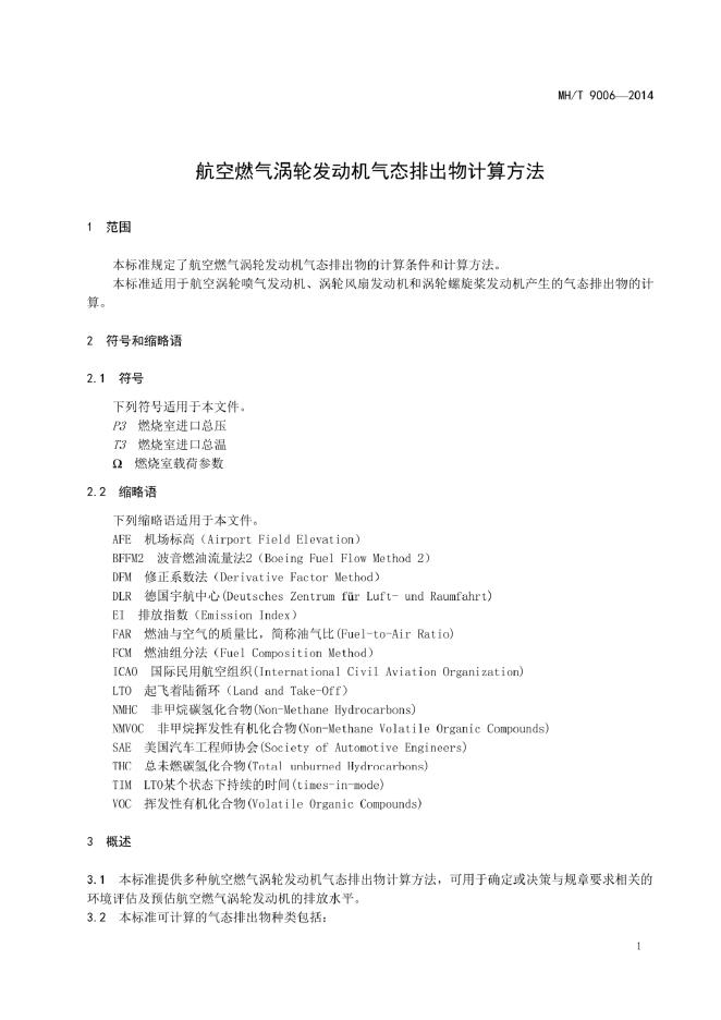 MH/T 9006-2014 航空燃气涡轮发动机气态排出物计算方法