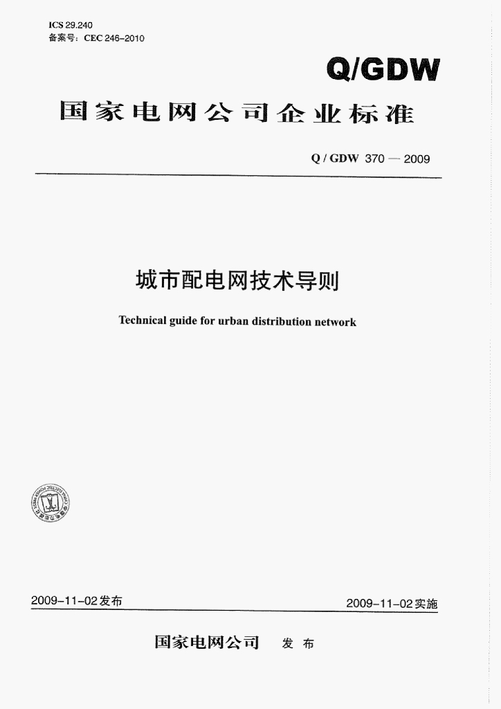 Q/GDW 370-2009 城市配电网技术导则