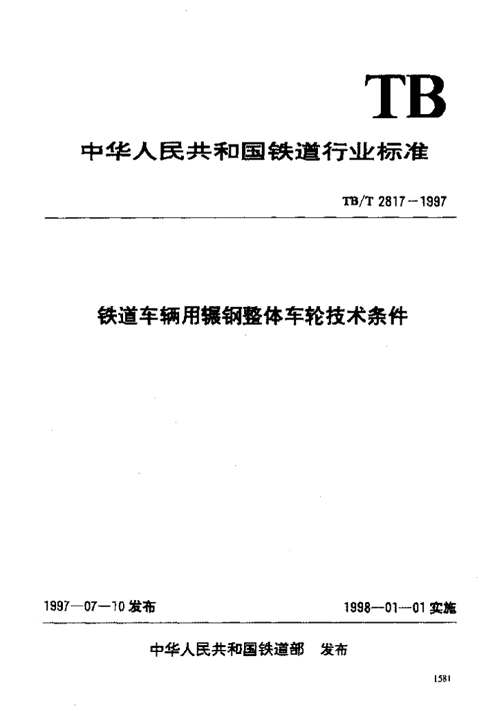 TB/T 2817-1997 铁道车辆用辗钢整体车轮技术条件