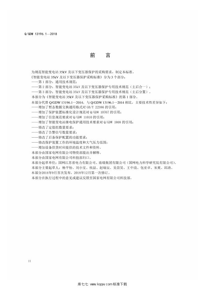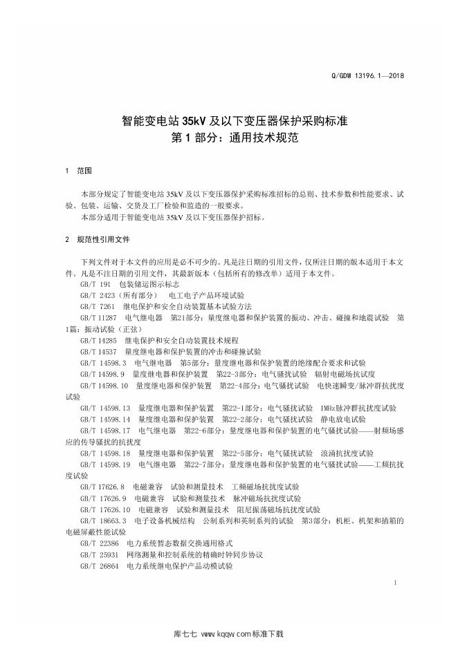 Q/GDW 13196.1-2018 智能变电站35kV及以下变压器保护采购标准 第1部分:通用技术规范